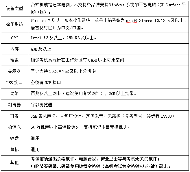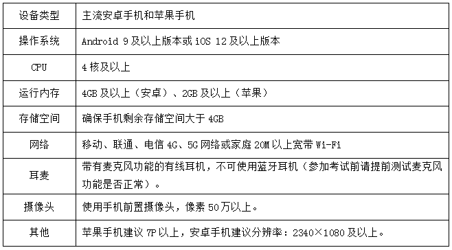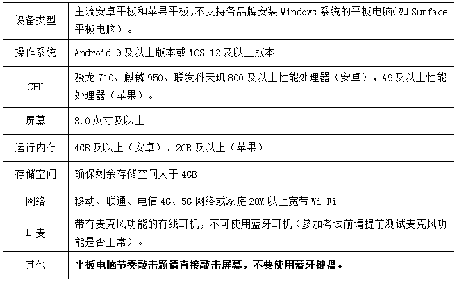 1.设备要求:考试支持计算机、Pad和手机3种设备类型,考生根据自身情况自备考试设备(至少1种),设备具体要求如下: